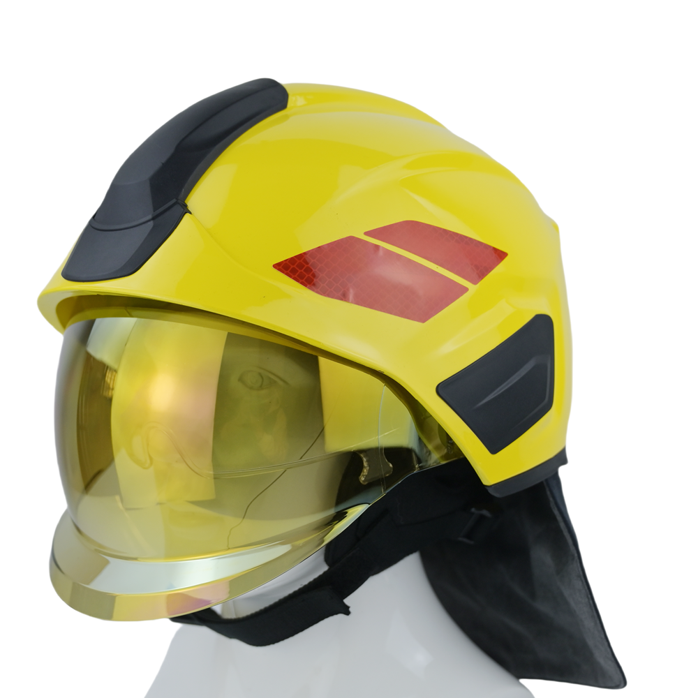 鋭利な物体からの衝撃、腐食、熱放射線に対する耐性があり、反射性、絶縁性、軽量性を持っています。ヘルメット内に空気呼吸器や無線通信システムを装着でき、明確な反射標識が付いています。